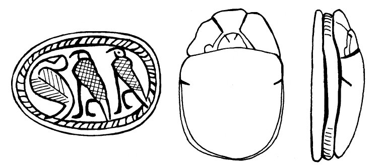 ![]() Glazed steatite scarab Found/Acquired at Gezer (Asia,Levant,Israel,Gezer) Period/Culture: Hyksos AN350528001 © The Trustees of the British Museum "White glazed steatite scarab: engraved on the base. Within a rope border two falcons face a uraeus. The falcons represent "the two lords", Horus and Seth, in the early form of royal protocol rather than the later title "the two ladies", i.e., " King of Upper and Lower Egypt". There is a hole pierced through longitudinally. Cracked." |