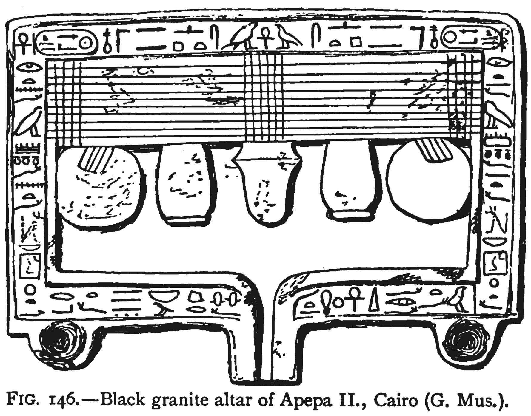 The Second Intermediate Period refers to the second period, (between the Twelfth and Eighteenth Dynasties, ca. 1800-1550 BCE), ancient Egypt fell into disarray, this time after Queen Sobekneferu (1806 BC – 1802 BC) died, leaving no heirs. The Hyksos came into power soon afterwards. The name “Hyksos” derives, via Greek, from the Egyptian epithet hekau khasut, ‘rulers of foreign (lit. mountainous) countries’ and was applied only to the rulers of the Asiatics. In itself it held no pejorative meaning.”1 The Hyksos' capital was Avaris (modern day Tell el Dab'a). “Aamu was the contemporary term used to distinguish the people of Avaris from Egyptians. It was used long before the Second Intermediate period and was still in use long after (Rameses II, for instance, uses it of his opponents at Kadesh) in order to denote, in a general sense, the inhabitants of Syria-Palestine. Egyptologists conventionally translate aamu as ‘Asiatics’ (that is, inhabitants of Western Asia).”2 Set was the “local god of Avaris, just as Amun was the patron deity of Thebes. Seth's cult may have evolved from a blending of a pre-existing cult at Heliopolis with a cult of the North Syrian weather-god Baal Zephon, which was introduced by the Asiatics.”3 Set had been the local god before the Hyksos took control of Avaris. By the Fifteenth dynasty, they ruled Lower Egypt as well. The 15th Dynasty king Apepi (aka Apepa or Apophis) is considered their strongest ruler. Apepi went by three different prenomens: Awoserre, Aqenenre and Nebkhepeshre. Thus it was that earlier scholars thought there were two different rulers named Apepi. W.M.F. Petrie refers to him as ‘Apepa II’ and writes, “The statues of Mer-meshau, at Tanis, have down the right shoulder of each a line of added inscription”, referring to Apepi as ‘son of Ra’, “beloved of Set”.4 Furthermore, “In Cairo a fine and perfect altar of black granite (Fig. 146) was found, dedicated to Set of Hauar, or Avaris, by this king; it probably came from Memphis or Heliopolis (M.D. 38). Now in Ghizeh Museum.” 5 We can see the ‘neb’ glyph (for ‘Lord’) underneath Set animals on the left and right sides of this offering table, (pictured above).