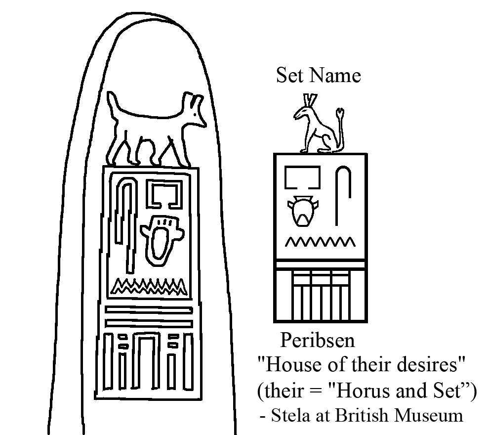 "Since the reign of Peribsen, the Libyan god Ash can be depicted with the head of Seth, as well as with a human head or a falcon's heas. We see then that a considerable time before the N.K. Ash, the foreign god, could be conceived as a form of revelation of Seth, the lord of foreign countries." (Seth, God of Confusion: A Study of His Role in Egyptian Mythology and Religion, by H. Te Velde, page 114) Let's have a closer look at Peribsen's name: "So far as could be checked, only one king took a separate Seth name besides his Horus name. This happened in the 2nd dynasty. The Horus name of this king was Sekhemib and his Seth name was Peribsen. We are justified in calling it a Seth name, because the Seth-animal is depicted over the serekh, instead of the usual Horus falcon." 1 All the translations I've seen of Peribsen’s name are making a "pri" out of a "per". "Per" means "house, palace, seat of government"2. "Pri" means "go, come out, be reknowned, burst forth, go up, ascend", via Faulkner (via Cintron)3. TeVelde's Garnot seems to take the 'pri' as perhaps to 'come out' and be 'revealed', for as translated from the French, I get “The desires of both are revealed.”4 But what if the 'per' is really a 'per'? To say of the king that he is “the house of their desires” is to say that the two gods DWELL within him, and thus their hearts, their desires are within him. I think this is closer to what the ancients meant. Not only that, as we examine the hieroglyphs in Faulkner's Dictionary , we see 'Pri' is formed of three glyphs, not just the 'per' glyph, but also the 'ren' glyph and the 'walking feet', which are not in Peribsen's name.5