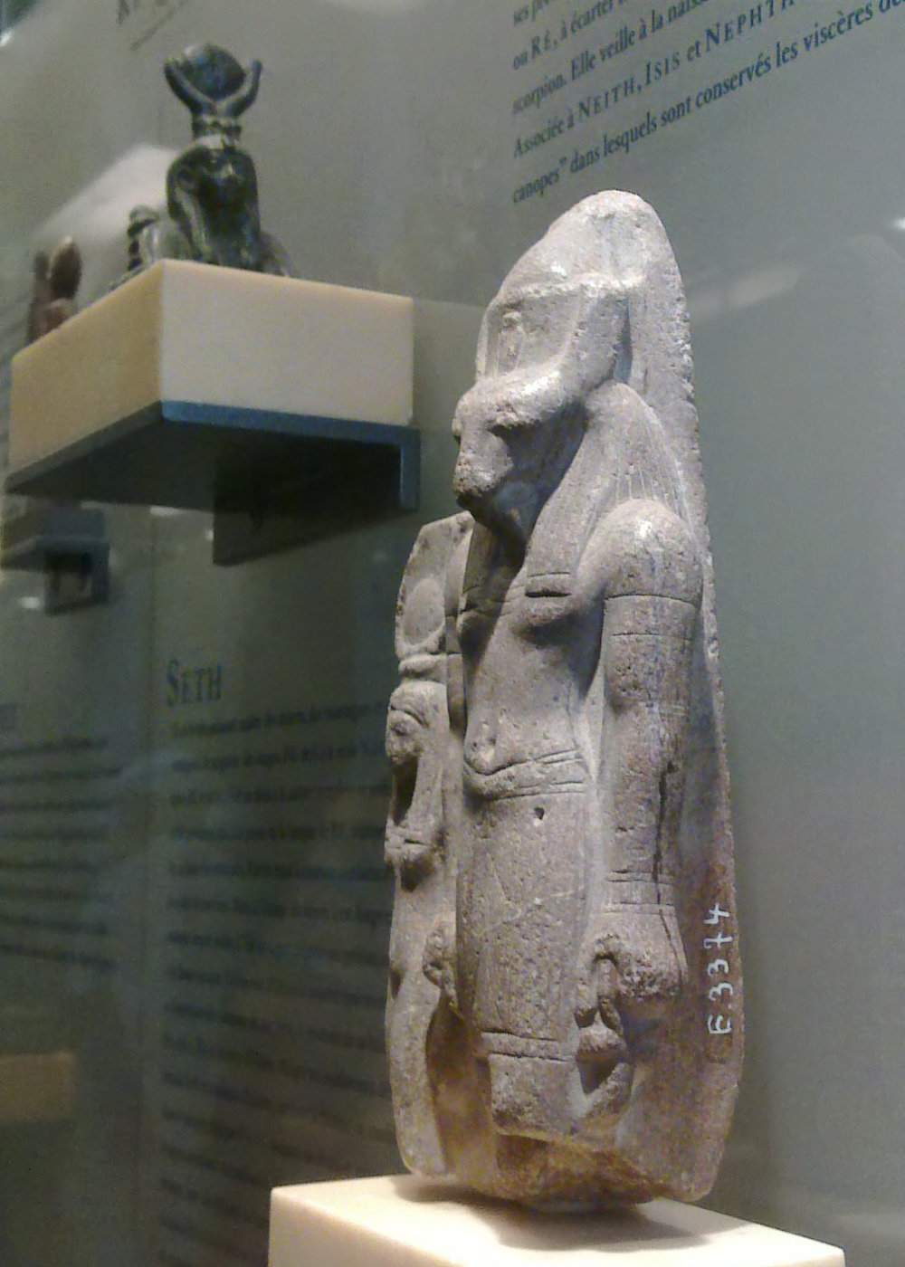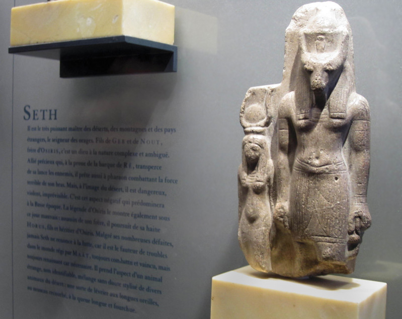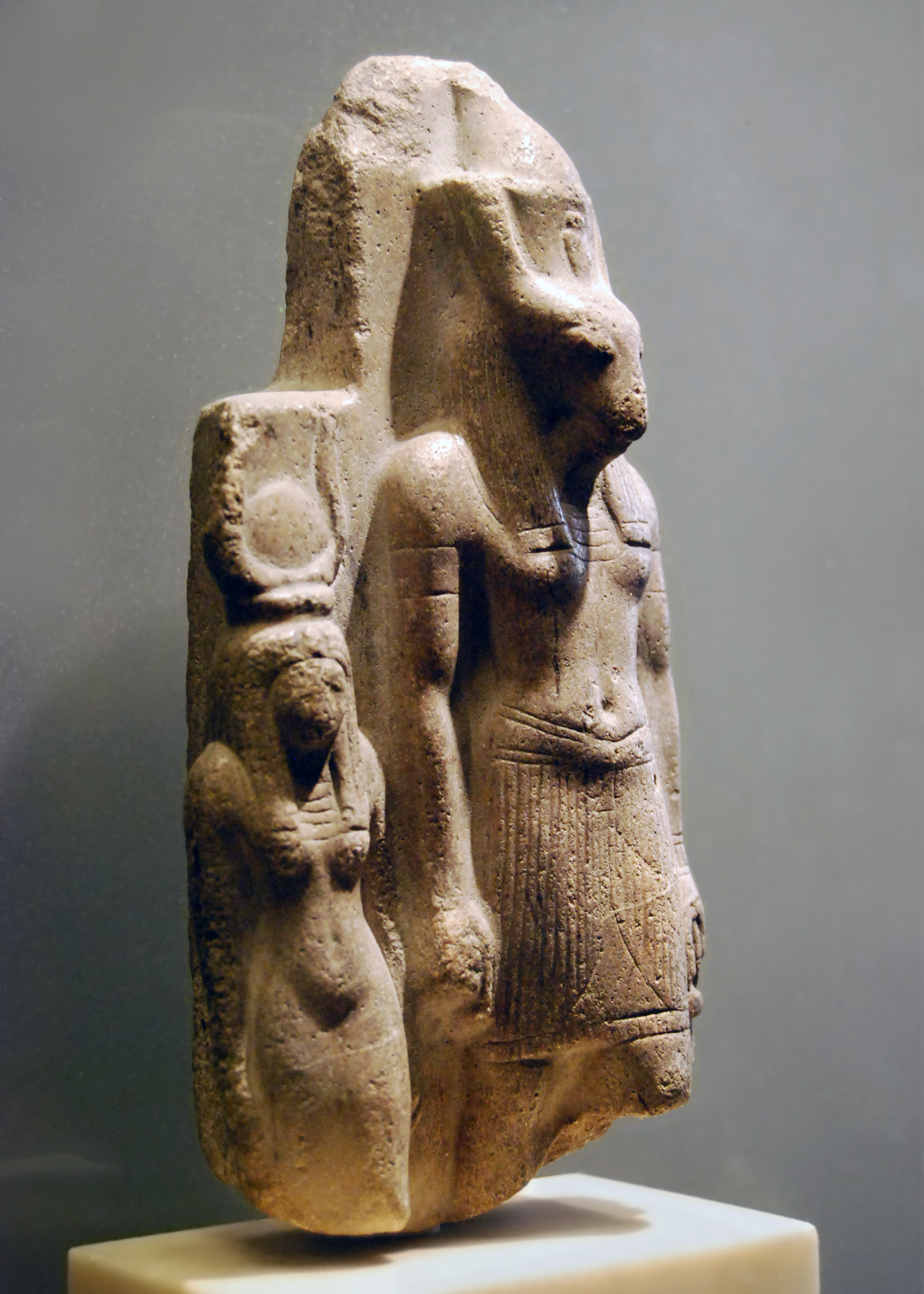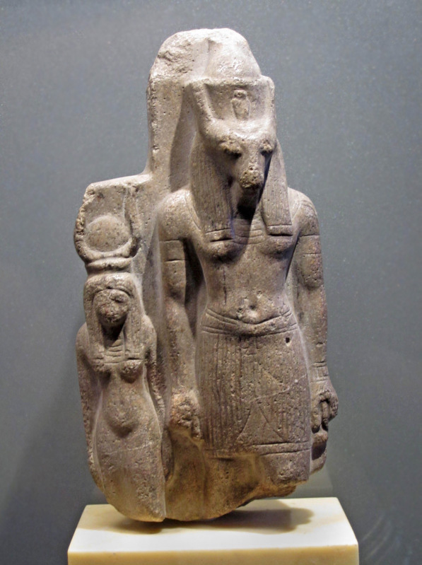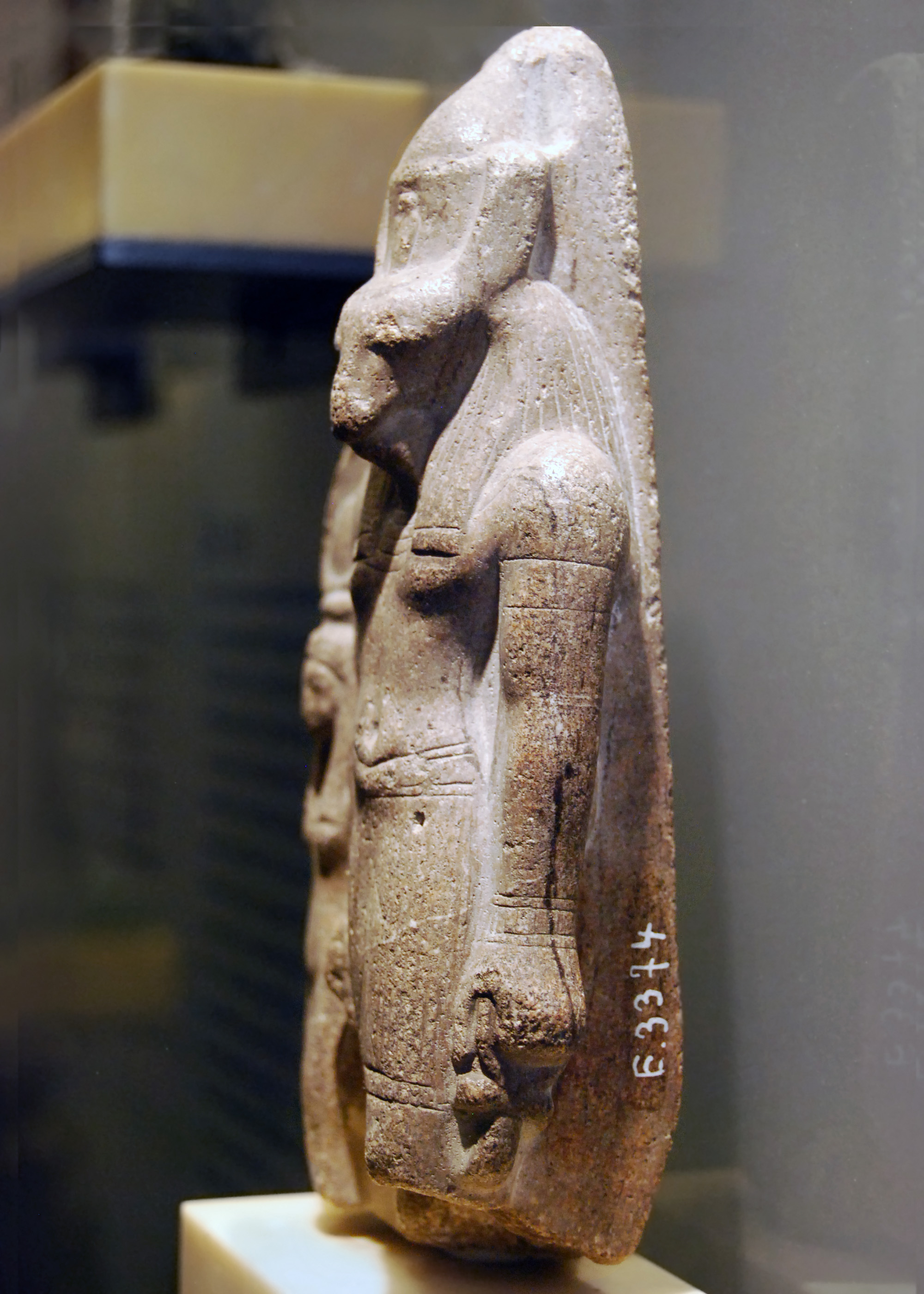 According to TeVelde, we know this is Nephthys because her name is inscribed on the back. Why is she so much smaller than Set? The typical answer given is because she was seen as having lesser importance. But it simply could be that's all the bigger piece of stone the sculptor had, and he'd rather put her in than not have her. |