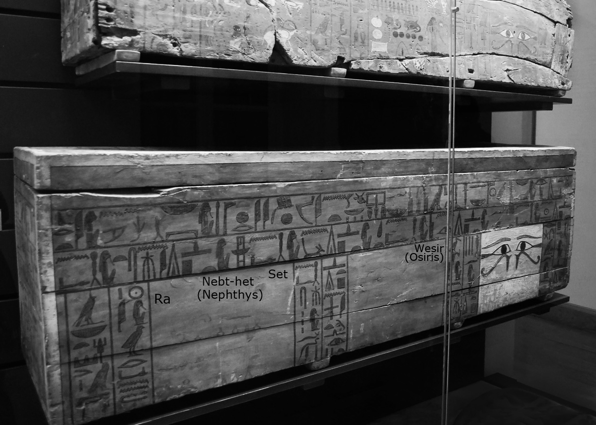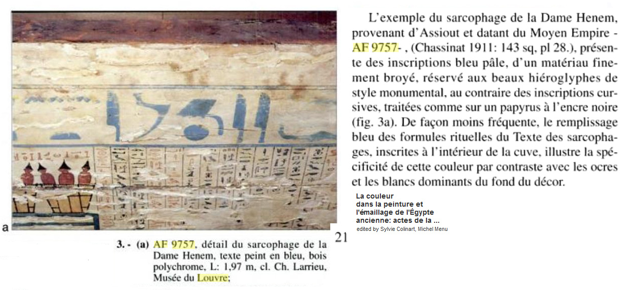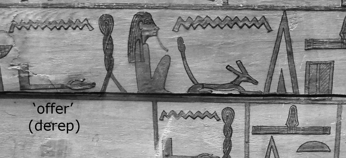 "Henem", rather than "Henen", but the center portion of the glyphs in the example photo, which must come from the interior of the coffin, ("inscrites à l'intérieur de la cuve"), match those on the side panel. At least we know it's from the Middle Kingdom. What can we find out by examining the text itself? With my rudimentary hieroglyphic skills, I can detect several happy gods goddesses, (aka "contented" - "hotep"), having been given offerings. |