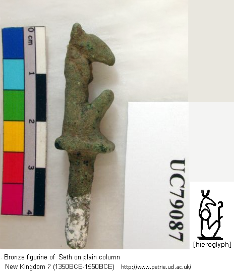 ![]() Bronze figurine of Seth on plain column Period - New Kingdom ? (1350BCE-1550BCE) Petrie Museum UC79087