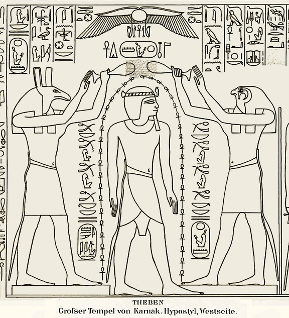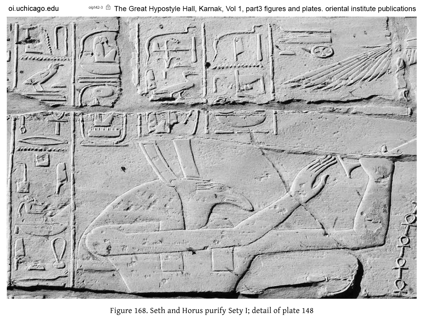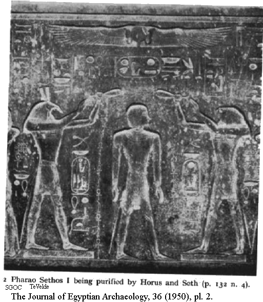 ![]() "Pharoa Sethos I being purified by Set and Horus" The Journal of Egyptian Archaeology, 36 (1950), pl. 2.