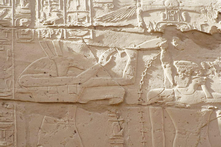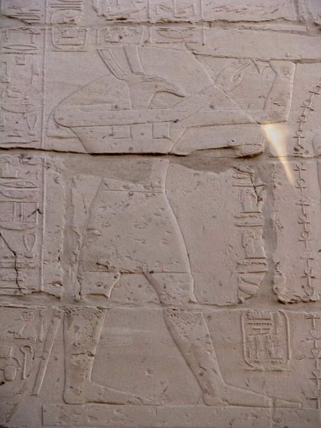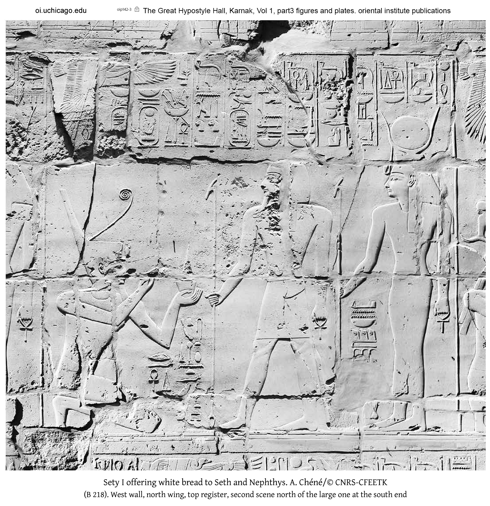 ![]() Photo credit Mark Roblee Because Mr. Roblee is taller than I am, his photo shows the top side as well! Here we see Seti I offering bread to a human headed Set and Nephthys in the Hypostyle Hall: