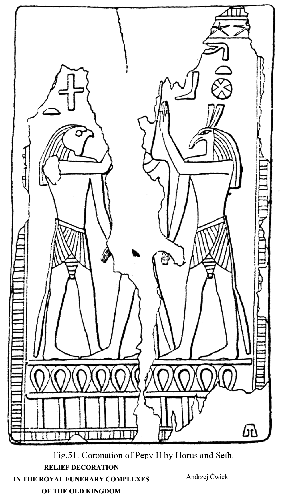 ![]() Unas stands between Horus and Seth during a kingship rite. Reconstruction from relief fragments found at his pyramid temple at Saqqara