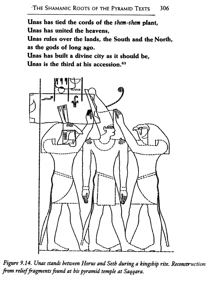 Naydler explains this scene: "In a possible reference to a baptismal ceremony associated with his accession, the king is described as 'the third at his accession.' As a third, he would be between Horus and Seth (or Horus and Thoth), who would be standing on either side of him and would pour baptismal water over him. The position of the king between the dual gods, receiving blessings from both, symbolizes his union of their opposing natures within himself."(pages 305-306) The baptismal water he refers to shows in a much later relief "Horus and Thoth purifying Ptolemy XIII at the temple of Kom Ombo". In both Unas and Ramses III, the deities have their hands at the pharoah's crown. I wondered at this change to Horus and Thoth, rather than Horus and Set, and thought it was due to changing attitudes towards Set. But Wilkinson shows this is not so, for even when Set is not shown, he is still understood to be there: