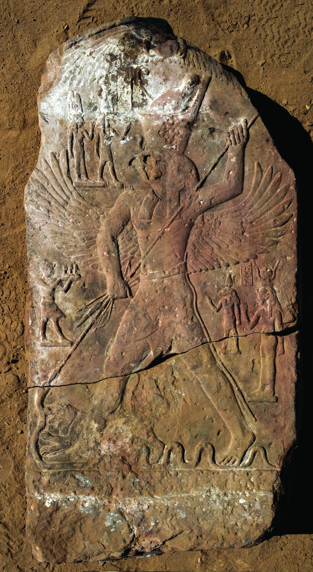 with wings (in the Egyptian style) and armed with a lance, overpowers the horned snake on a Ramesside level scarab from Tell el-Far'ah (south)(illus. 87b). By