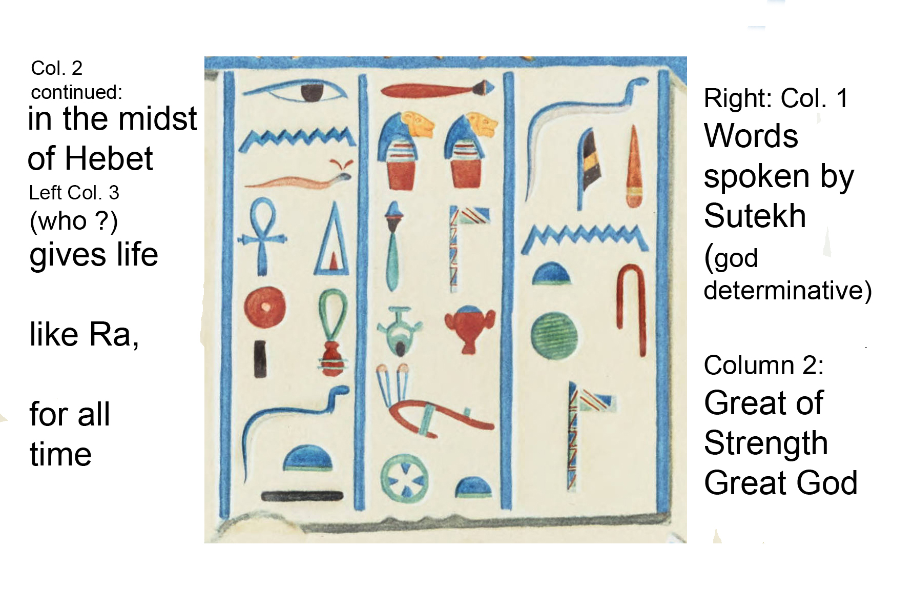 ![]() Going Right to Left: "Words spoken by Sutekh (god determinative), Great of Strength, Great God in the Midst of Hebet (who?) gives life like Ra for all time". Here is some more recent photos. Repairs have been done since Davis' old image:
